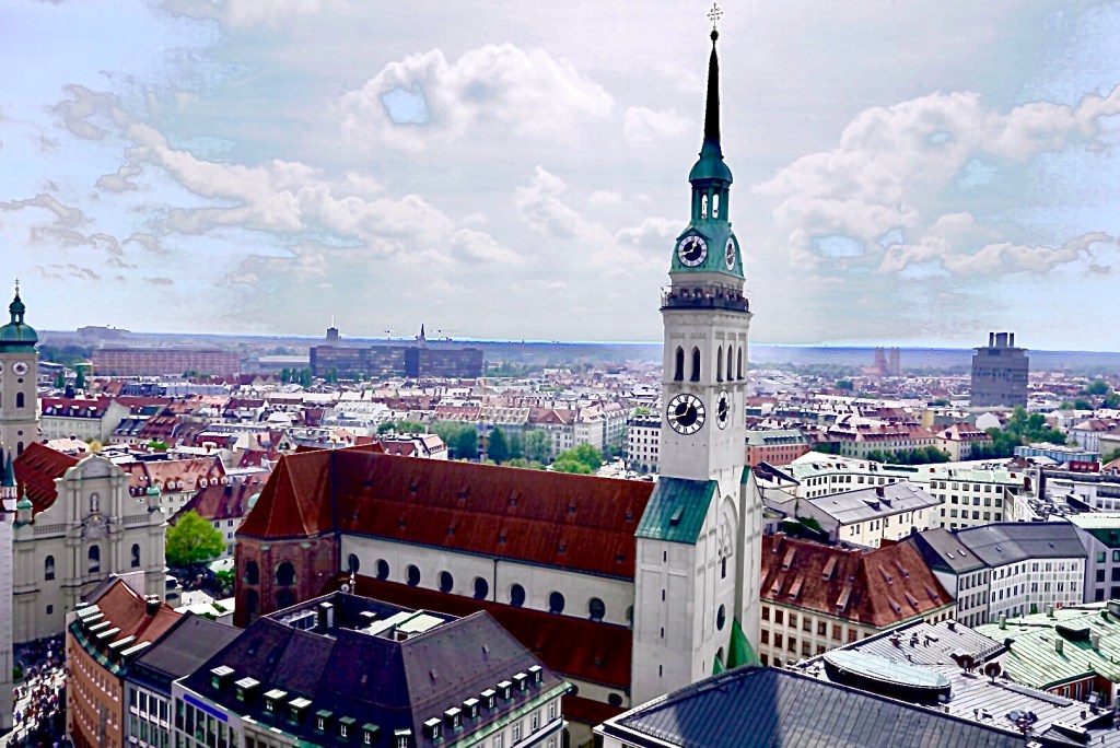 The Rathaus tower: We decided to take the tower up to the top of the Rathaus, because the line didn’t look bad. The tickets were not too much and we actually partnered with a group behind us, as they were two people short of the group discount! There are two elevators that take you up to the top of the main tower. As you make your way around, it almost feels like you are getting on some type of Disneyland ride. Quite different than most towers that we climbed in Europe. It was our first sweeping look at the city of Munich. Very pretty and it sounds like when it’s a clear day, you can see as far as the Alps. It has a wonderful view of Frauenkirche and you can really get some wonderful photos from here.