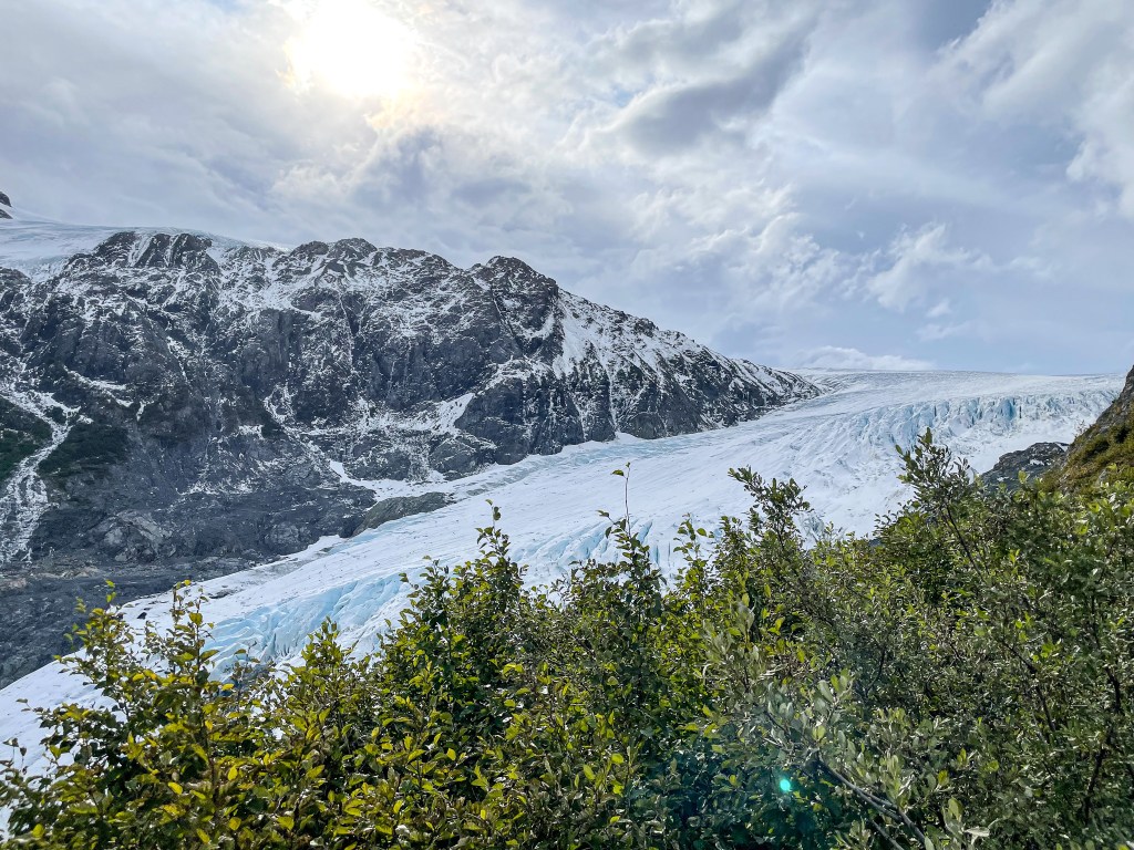 Rain was expected on our visit so we didn’t do the full trail. We stopped at Marmot Meadows, which was still a beautiful hike. The hike starts by going through the forest floor. Draped with leaves and trees, the elevation gain starts with some slick rocks to traverse as you climb. As you get about half way, you’ll come to a waterfall. A great view and place to stop and watch the water trickle down. As you cross the bridge, you start climbing in elevation again. Making your way higher in elevation as you get some wonderful views as you make your way up. We saw numerous large waterfalls in the distance as we worked our way up. We didn’t get to see any wildlife for the most part, some unique birds but none of the mammals we hoped to see. As the clearing came and we saw the sign for Marmot Meadows, it didn’t look overly significant. Luckily we passed someone on the way that told us to take a trail to the left when we got to the sign. It was a quick 5 minutes before we got to a beautiful view of the exit glacier before us. We sat and ate our sandwiches before heading back down. The hike back to the parking lot took us about 45 minutes and was much quicker because of it mostly being downhill. Overall we enjoyed the hike and it was around 3 miles round trip.