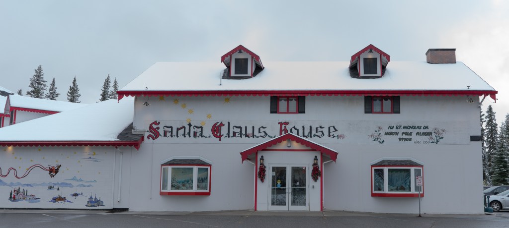 Starting our last day out in the Fairbanks area, we awoke to more snow coming down from the sky! The roads looked like they were becoming a bit worse so we headed out to our next venture. Saying goodbye to our wonderful time at the hot springs. Our first stop on the drive was to visit the town of North Pole.